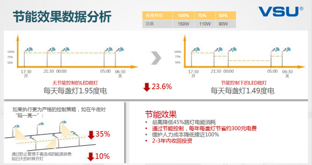 VSU依托公司在單燈控制器、集中控制管理器和硬軟件系統(tǒng)集成開發(fā)能力,成功開發(fā)VSU智慧路燈。VSU智慧路燈具有以下特點: