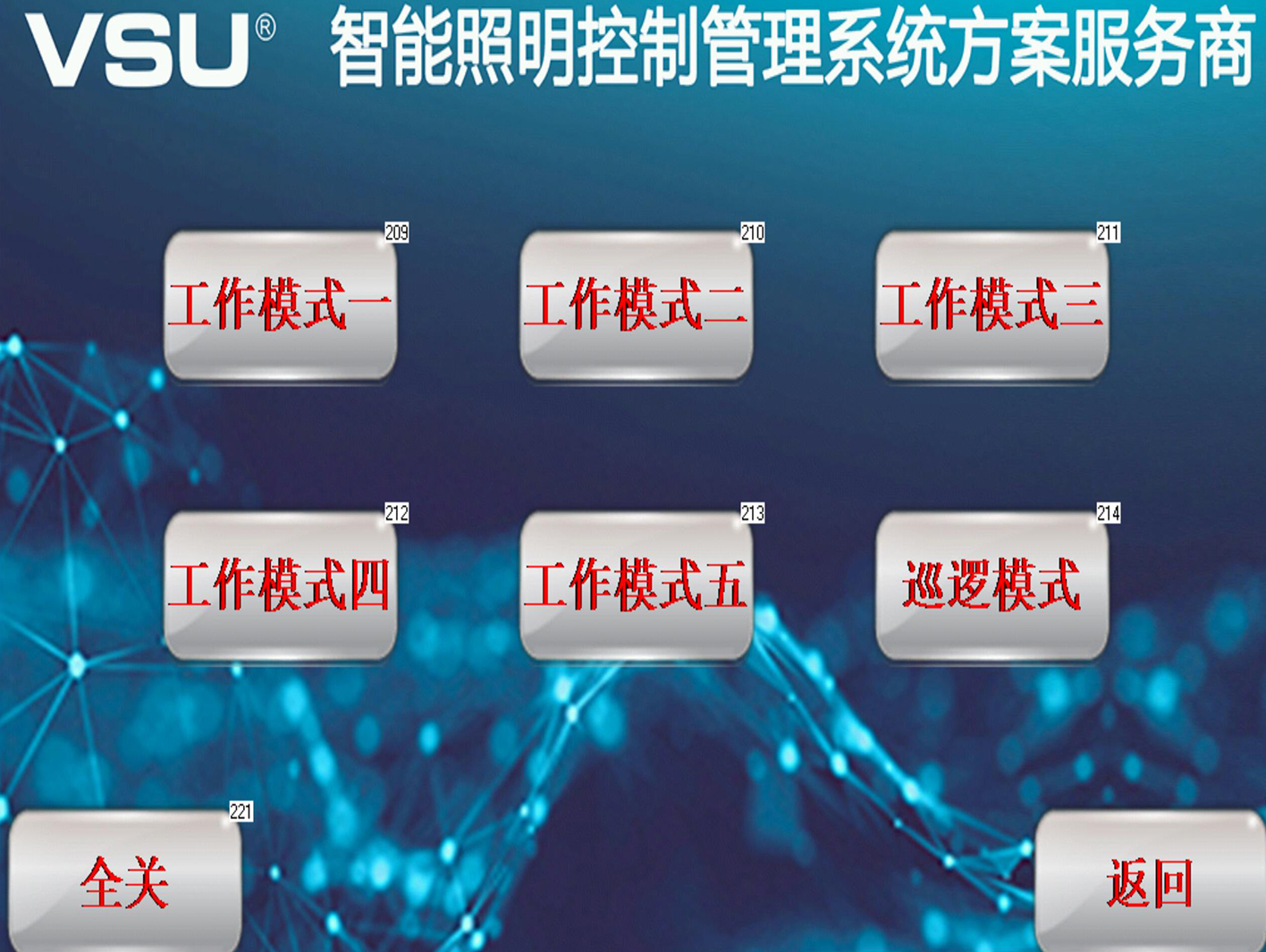 該項(xiàng)目中在智能照明領(lǐng)域采用的是VSU-NET總線型智能照明控制系統(tǒng),8路、12路、16路16A智能照明模塊、6鍵面板、7寸觸摸屏、電源模塊、網(wǎng)關(guān)模塊、級(jí)聯(lián)模塊等系列設(shè)備形成整個(gè)智能化照明控制系統(tǒng)。