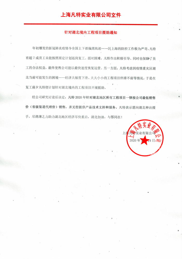 經(jīng)公司研究討論后決定:凡特2020年針對(duì)湖北地區(qū)所有工程項(xiàng)目一律按公司最低銷售價(jià)(省級(jí)渠道代理價(jià))銷售,并無(wú)償提供產(chǎn)品技術(shù)支持和服務(wù)。凡特表示愿向湖北伸出援手,盡綿薄之力助力湖北地區(qū)經(jīng)濟(jì)盡快重啟,湖北加油,與鄂同在!