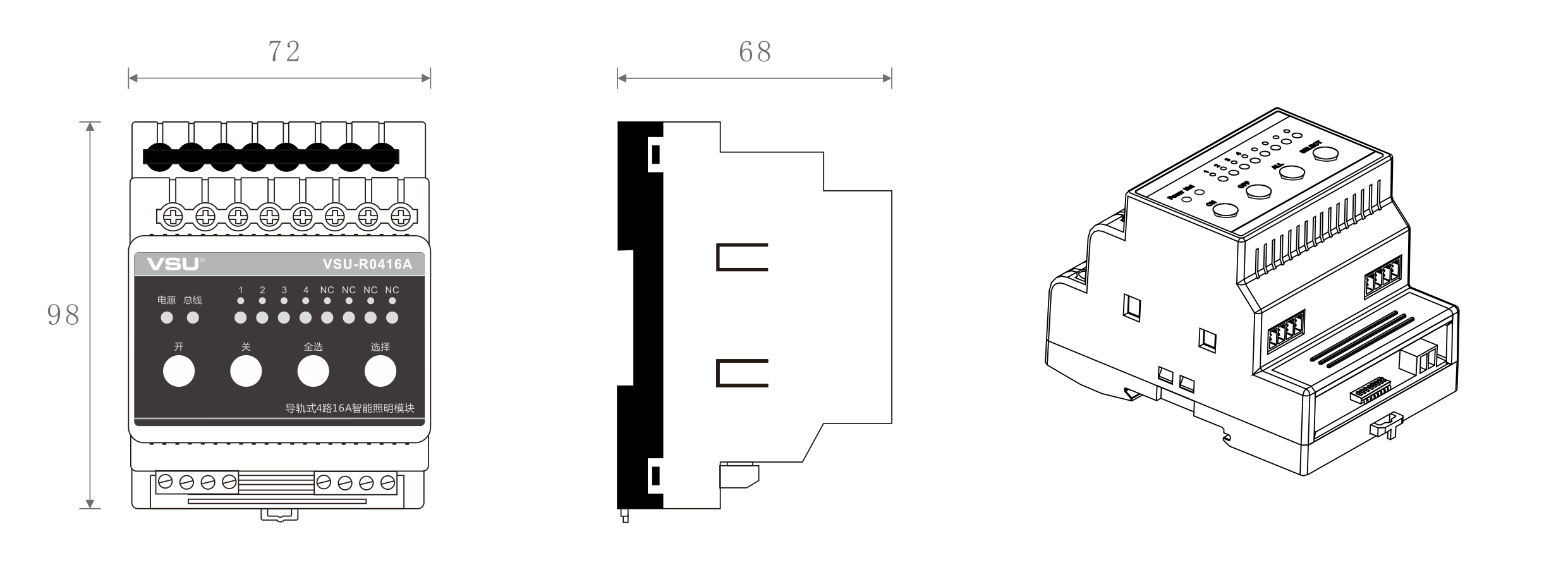 1,標(biāo)準(zhǔn)導(dǎo)軌式安裝占4個模數(shù)位;