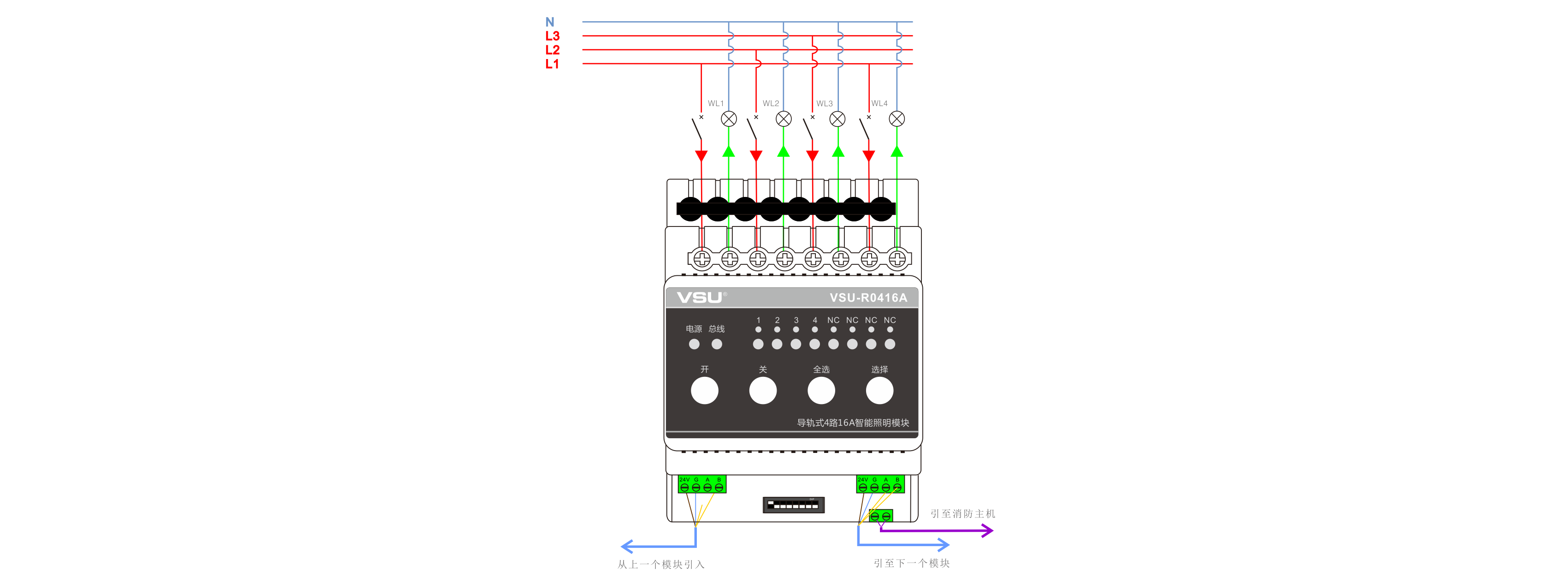 本產(chǎn)品為導(dǎo)軌式安裝,含4路智能繼電器,每回路可獨(dú)立控制3520W燈具的開關(guān),帶應(yīng)急按鍵,LED燈時時指示各個回路開關(guān)狀態(tài)