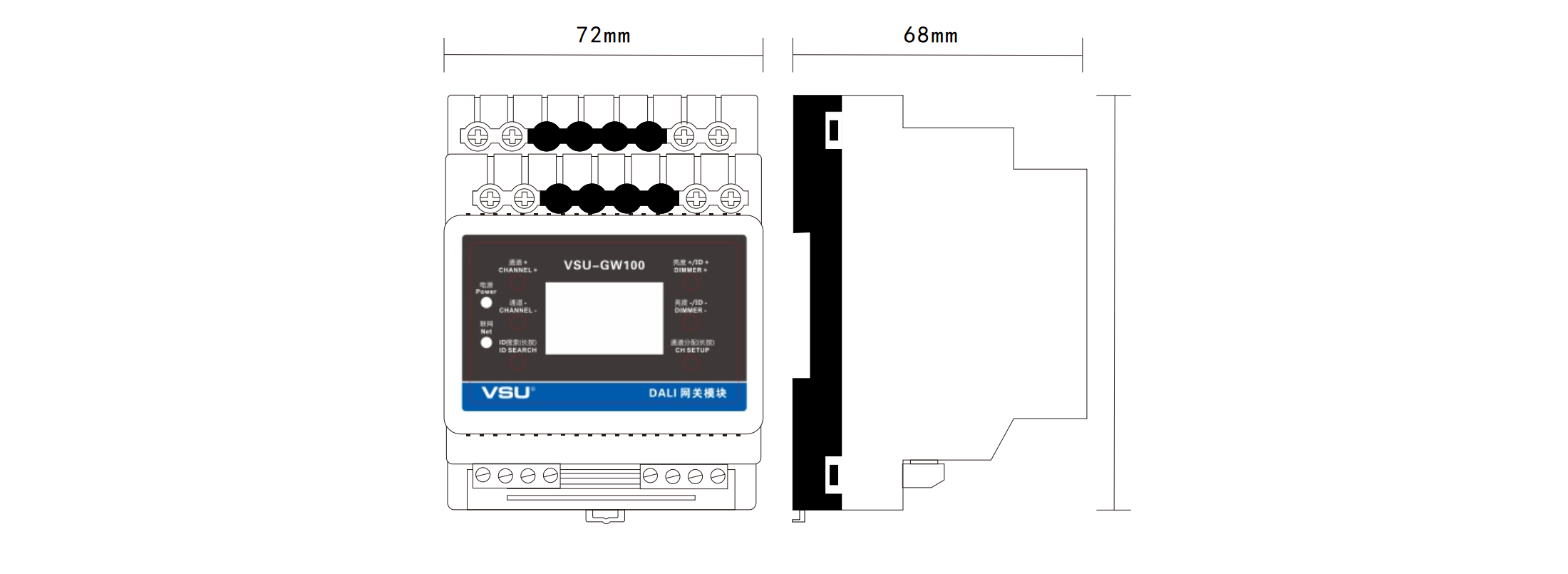 1.標(biāo)準(zhǔn)導(dǎo)軌式安裝占4個(gè)模數(shù)位; 2.VSU-Net總線信號(hào)轉(zhuǎn)換成DALI總線信號(hào);